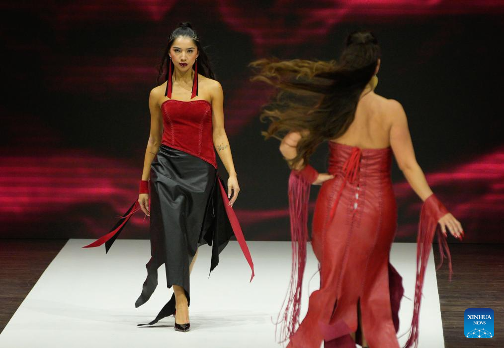 Models present creations during the runway show at Vancouver Indigenous Fashion Week 2025 in Vancouver, British Columbia, Canada, Nov. 19, 2025. (Photo by Liang Sen/Xinhua)