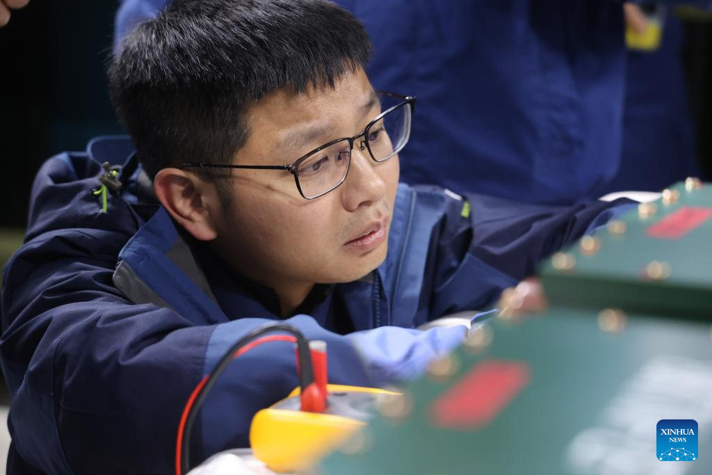 A staff member carries out battery handover and installation work on Nov. 16, 2025. China on Tuesday launched the Shenzhou-22 spaceship to provide a return vessel for the three Shenzhou-21 astronauts in orbit. This momentous occasion marked the accomplishment of the first emergency launch mission in the country's manned space program.