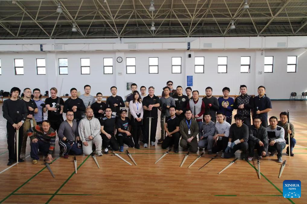 This photo shows a scene on a sword and shield course at the Shanghai Historical Martial Arts (SHMA) club in Shanghai, east China, Nov. 22, 2025. (Xinhua/Liu Ying)