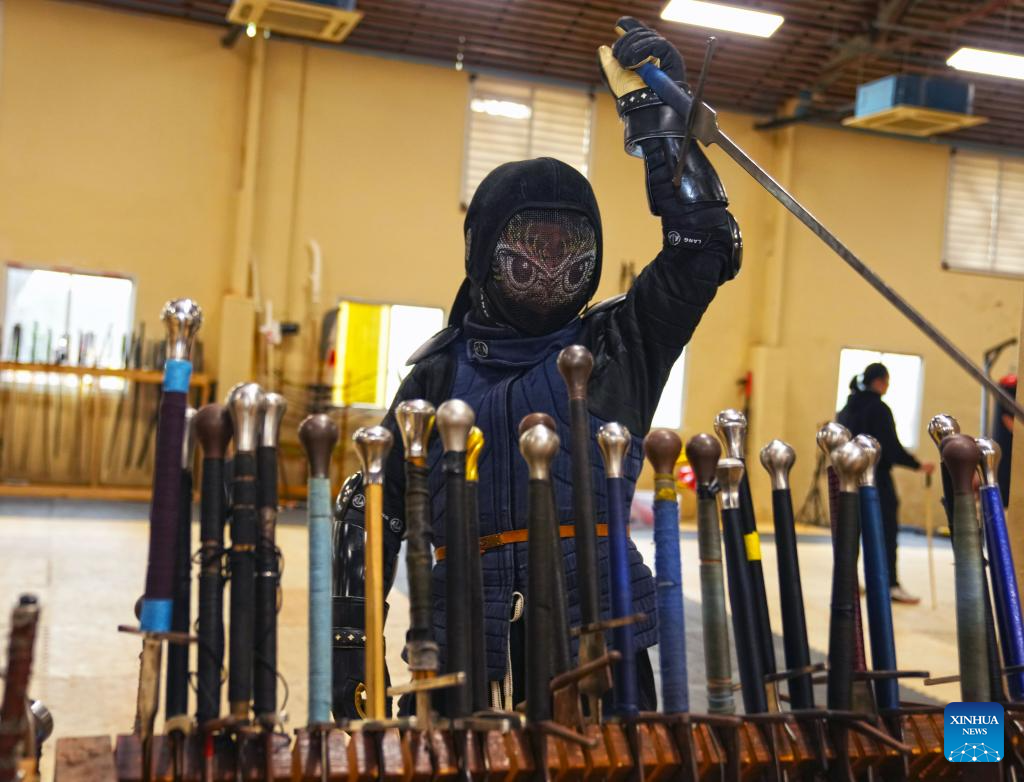 She Yuran prepares to practice longswords with a friend at the Shanghai Historical Martial Arts (SHMA) club in Shanghai, east China, Nov. 22, 2025. (Xinhua/Liu Ying)