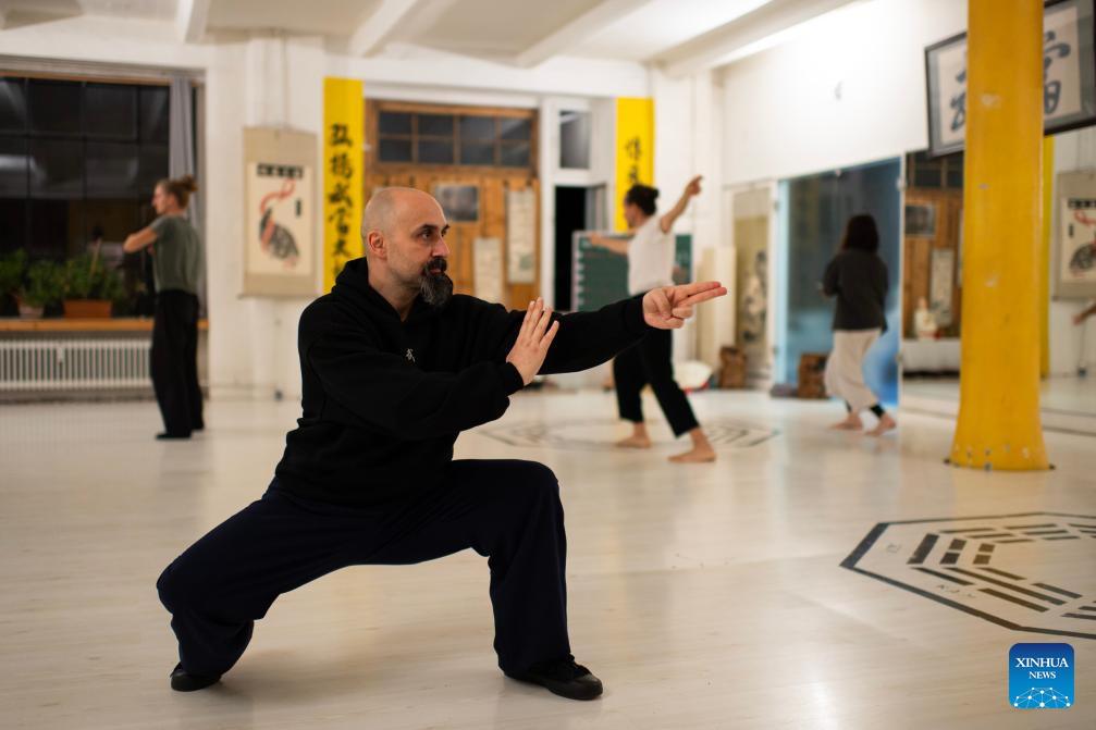 Ismet Himmet demonstrates Chinese martial arts at XUAN-Gong Fu Academy in Berlin, Germany, Nov. 13, 2025. (Xinhua/Zhang Haofu)