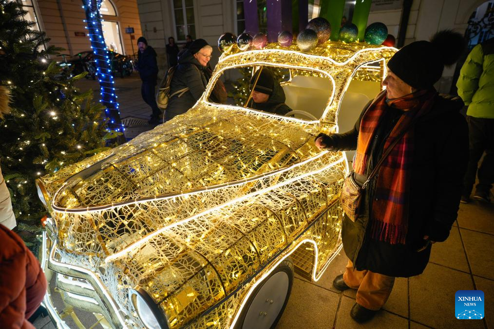 Visitors are seen next to a holiday light installation in the Old Town in Warsaw, Poland, Dec. 3, 2025. Christmas decorations bring strong festive vibe to the city. (Photo by Jaap Arriens/Xinhua)