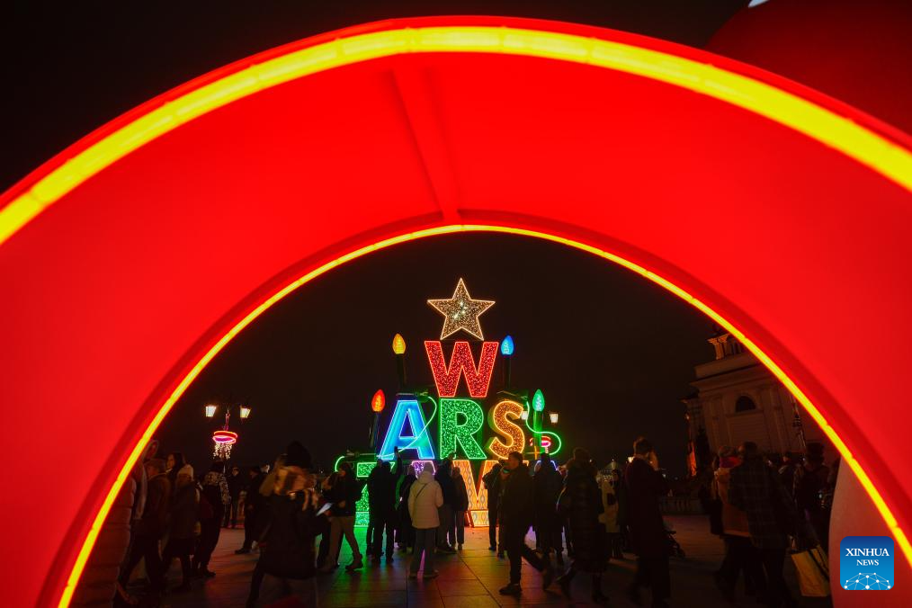 Visitors are seen next to holiday light installations in the Old Town in Warsaw, Poland, Dec. 3, 2025. Christmas decorations bring strong festive vibe to the city. (Photo by Jaap Arriens/Xinhua)