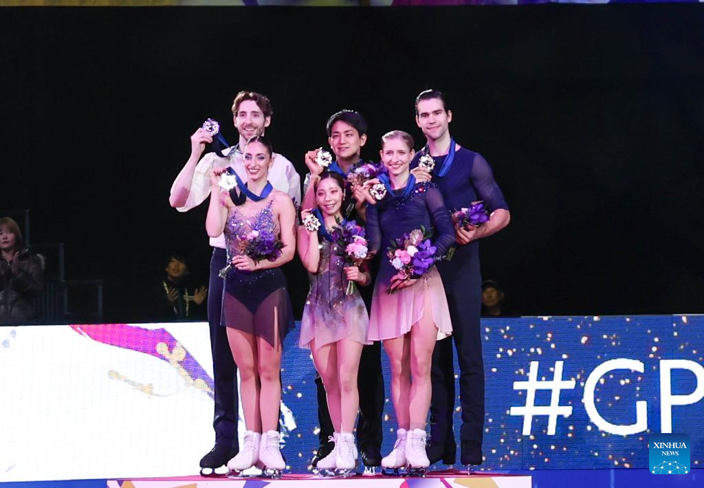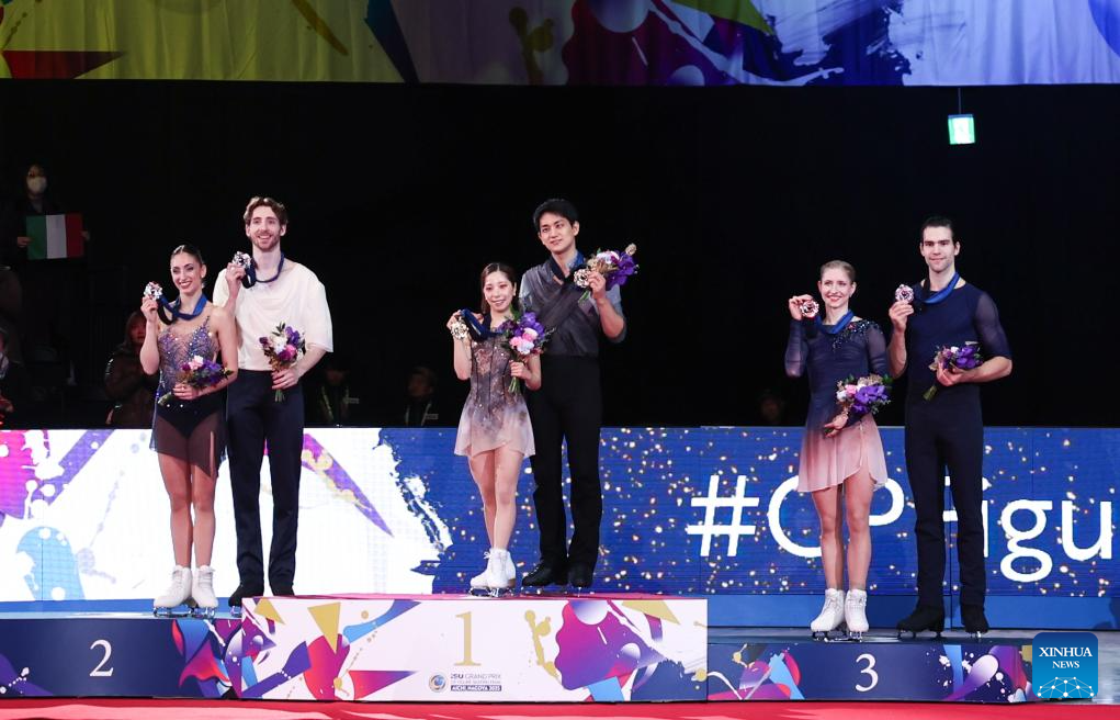 Gold medalists Miura Riku (3rd L)/Kihara Ryuichi (3rd R) of Japan, silver medalists Sara Conti (1st L)/Niccolo Macii (2nd L) of Italy and bronze medalists Minerva Fabienne Hase (2nd R)/Nikita Volodin of Germany pose during the awarding ceremony for the pair skating at ISU Grand Prix of Figure Skating Final 2025 in Nagoya, Japan, Dec. 5, 2025. (Xinhua/Yue Chenxing)