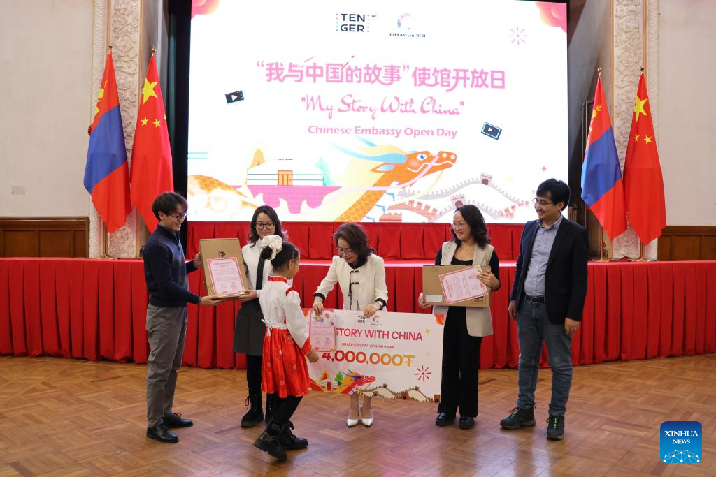 The award ceremony for the short video competition "My Story with China" is held at the Chinese Embassy in Mongolia, in Ulan Bator, Mongolia, Dec. 5, 2025. The Embassy of China in Mongolia on Friday hosted an open day event, which was attended by more than 200 primary and secondary school teachers, students and parents in Ulan Bator.(Xinhua/Bolortsetseg)
