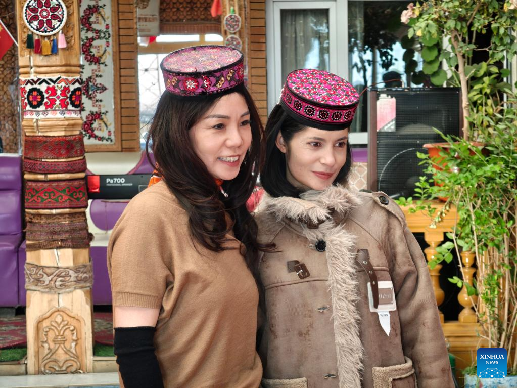 Banafsha Memetituheti (R) poses for photos with a tourist at a homestay in Tajik Autonomous County of Taxkorgan, northwest China's Xinjiang Uygur Autonomous Region, Oct. 29, 2025. (Xinhua)