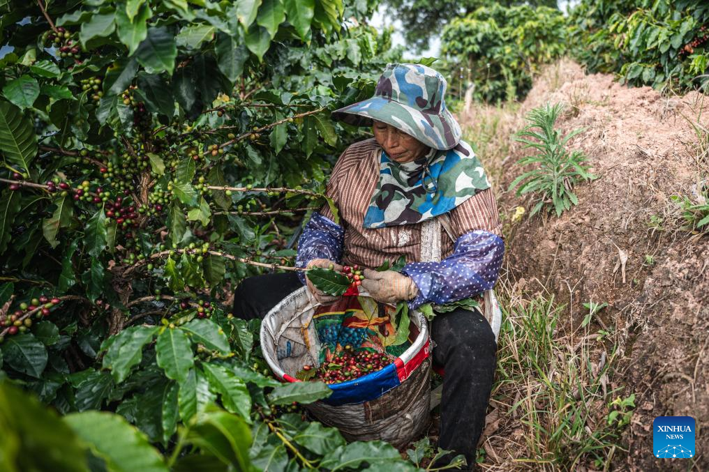 A farmer picks fresh coffee cherries in a coffee field in Pu'er City, southwest China's Yunnan Province, Dec. 6, 2025. Pu'er now has 703,900 mu (about 46,927 hectares) of coffee under cultivation, with an annual bean output of 84,000 tonnes. (Xinhua/Wang Guansen)