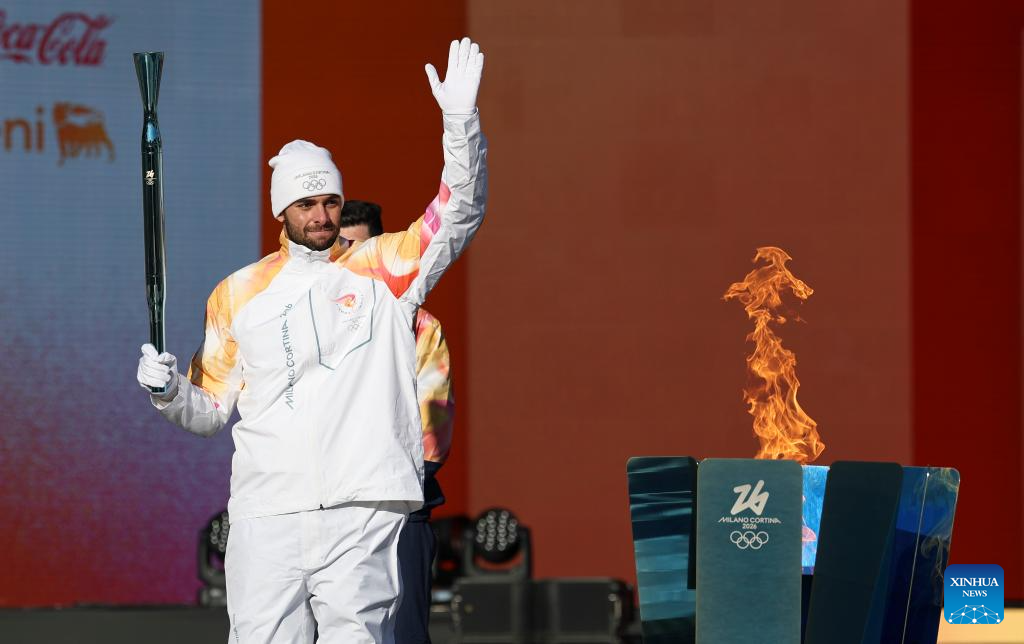 Italian swimmer Gregorio Paltrinieri lights the torch during the ceremony marking the official start of the torch relay for 2026 Milan-Cortina Winter Olympics in Rome, Italy, Dec. 6, 2025. (Xinhua/Li Jing)