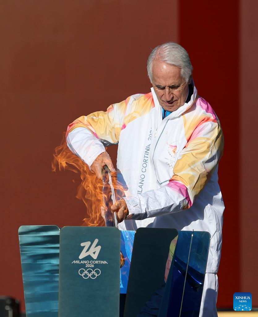 President of the organizing committee for the 2026 Winter Olympics Giovanni Malago lights the torch during the ceremony marking the official start of the torch relay for 2026 Milan-Cortina Winter Olympics in Rome, Italy, Dec. 6, 2025. (Xinhua/Li Jing)