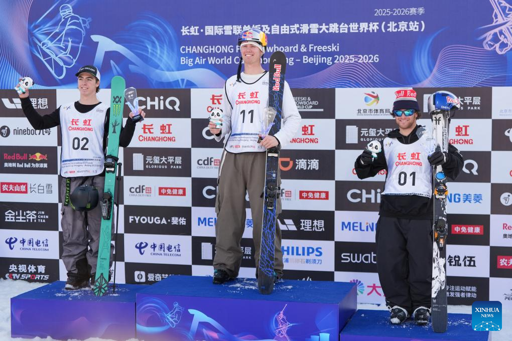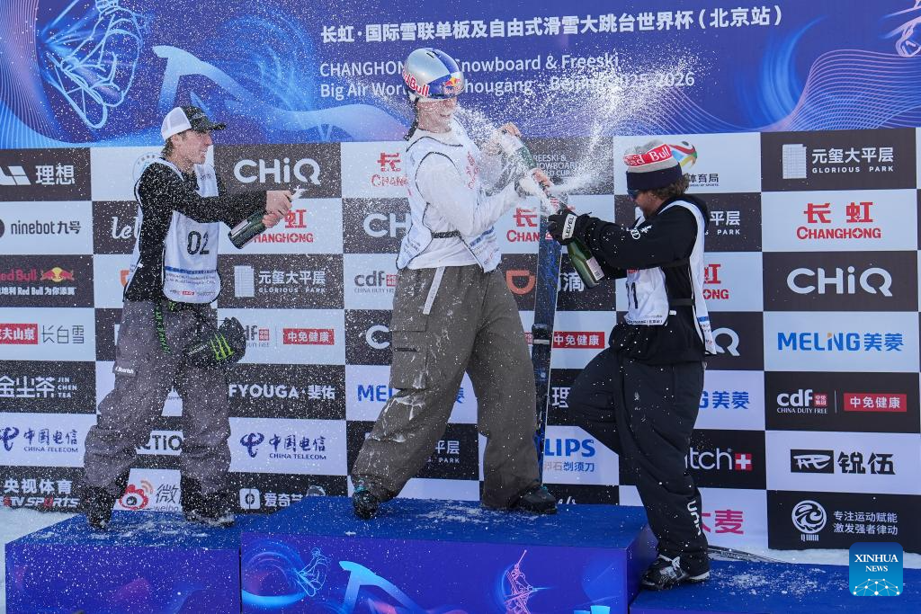 Gold medalist Ulrik Samnoey (C) of Norway, silver medalist Luca Harrington (L) of New Zealand and bronze medalist Matej Svancer of Austria celebrate during the awarding ceremony after the men's big air final at the FIS Freeski World Cup in Beijing, China, Dec. 6, 2025. (Xinhua/Ju Huanzong)