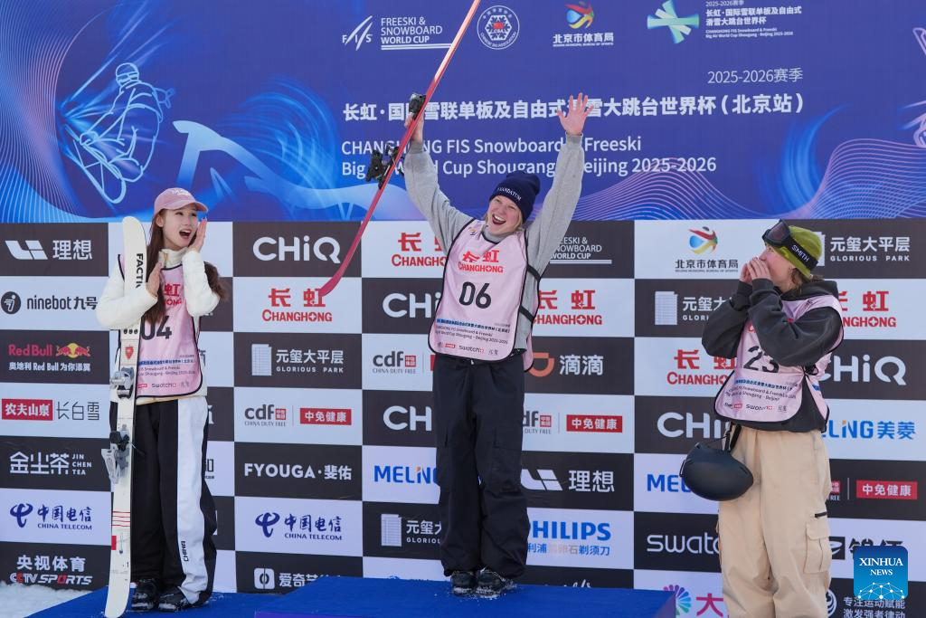 Gold medalist Anni Karava (C) of Finland, silver medalist Liu Mengting (L) of China and bronze medalist Naomi Urness of Canada celebrate during the awarding ceremony after the women's big air final at the FIS Freeski World Cup in Beijing, China, Dec. 6, 2025. (Xinhua/Ju Huanzong)