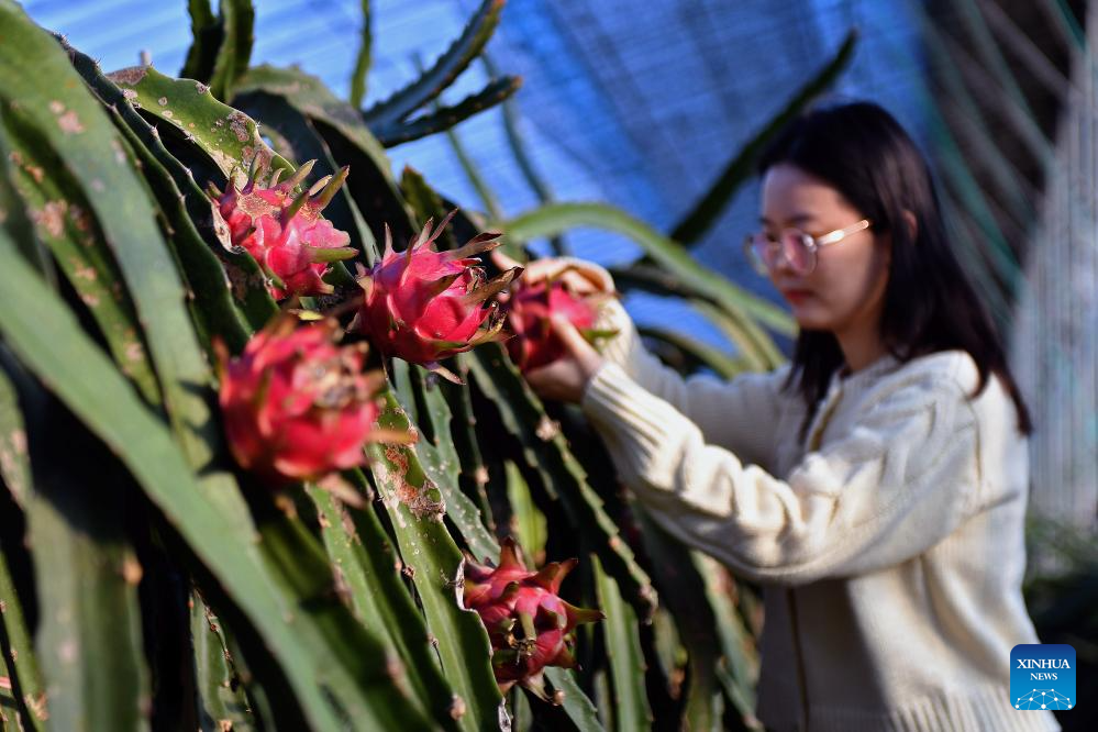 A woman picks pitaya in Yantai City, east China's Shandong Province, Dec. 6, 2025. As the solar term of Major Snow, also known as "Da Xue" in Chinese, is approaching, farmers are busy with agricultural production across the country. (Photo by Sun Wentan/Xinhua)
