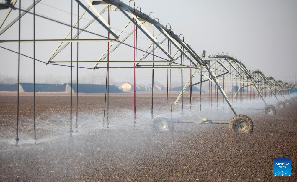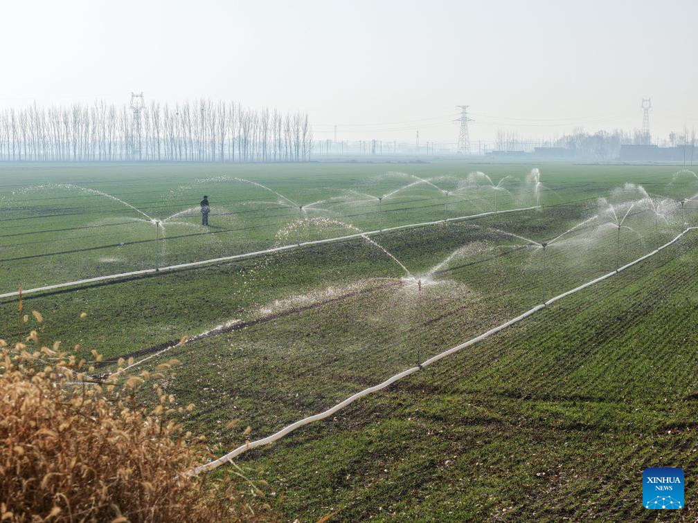 A drone photo taken on Dec. 6, 2025 shows intelligent sprinkler irrigation equipment working at a wheat field in Liaocheng City, east China's Shandong Province. As the solar term of Major Snow, also known as "Da Xue" in Chinese, is approaching, farmers are busy with agricultural production across the country. (Photo by Ma Hongkun/Xinhua)