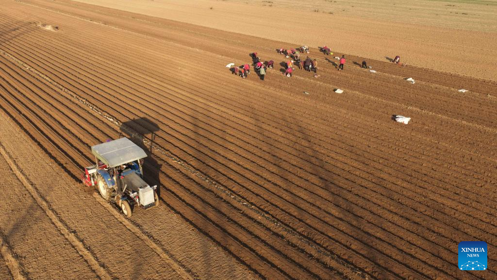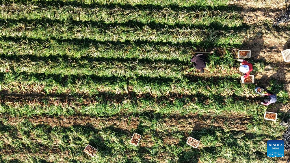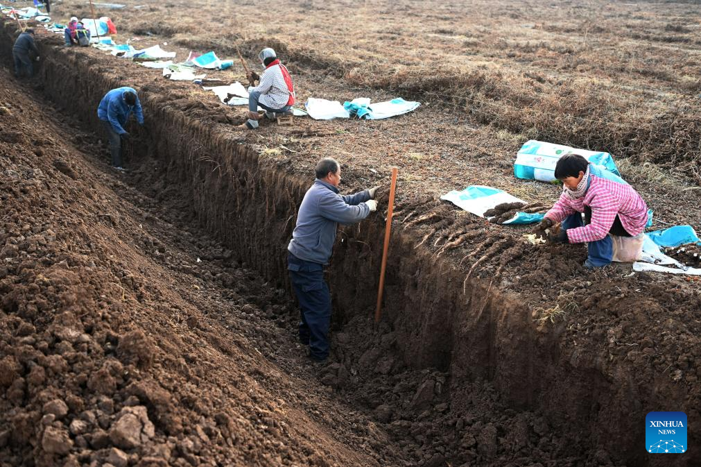 Farmers harvest crops of Chinese herbal medicine in Jiaozuo City, central China's Henan Province, Dec. 6, 2025. As the solar term of Major Snow, also known as "Da Xue" in Chinese, is approaching, farmers are busy with agricultural production across the country. (Photo by Xu Hongxing/Xinhua)