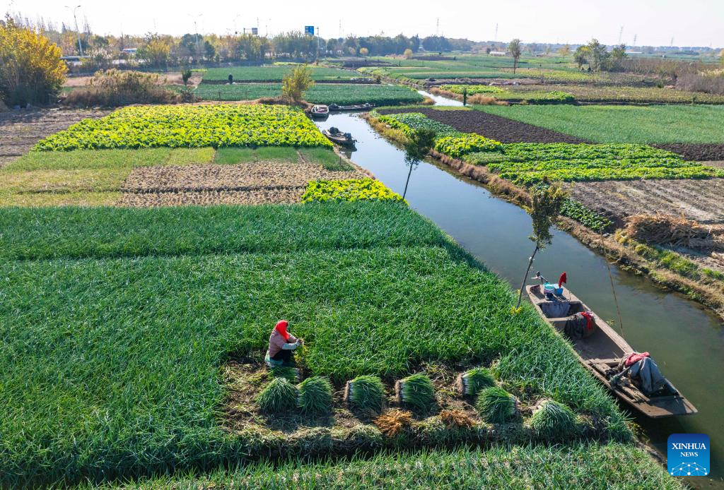 An aerial drone photo taken on Dec. 6, 2025 shows farmers harvesting chives in Xinghua City, east China's Jiangsu Province. As the solar term of Major Snow, also known as "Da Xue" in Chinese, is approaching, farmers are busy with agricultural production across the country. (Photo by Zhou Shegen/Xinhua)