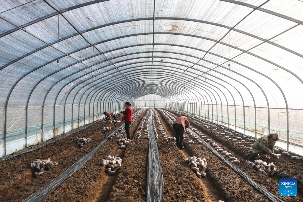 Farmers work at a greenhouse of morel mushrooms in Pingdingshan City, central China's Henan Province, Dec. 6, 2025. As the solar term of Major Snow, also known as "Da Xue" in Chinese, is approaching, farmers are busy with agricultural production across the country. (Photo by He Wuchang/Xinhua)