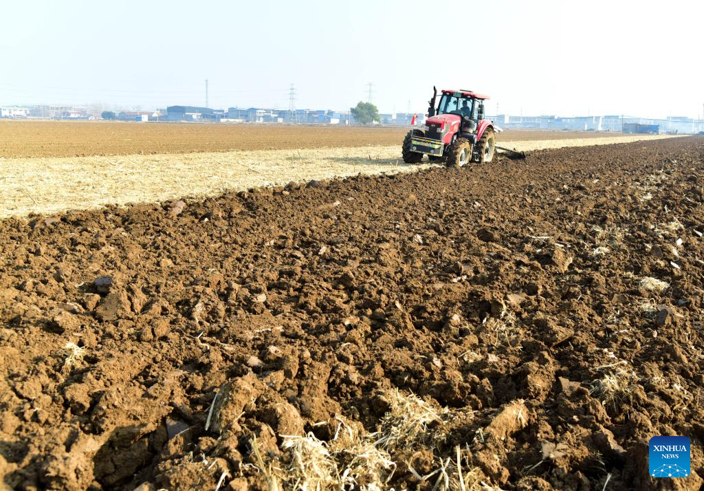 A tractor ploughs a field in Zaozhuang City, east China's Shandong Province, Dec. 6, 2025. As the solar term of Major Snow, also known as "Da Xue" in Chinese, is approaching, farmers are busy with agricultural production across the country. (Photo by Liu Mingxiang/Xinhua)