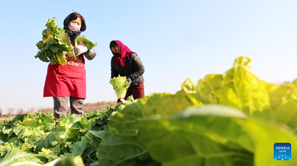 Farmers harvest Chinese cabbages in Lianyungang City, east China's Jiangsu Province, Dec. 4, 2025. As the solar term of Major Snow, also known as "Da Xue" in Chinese, is approaching, farmers are busy with agricultural production across the country. (Photo by Geng Yuhe/Xinhua)
