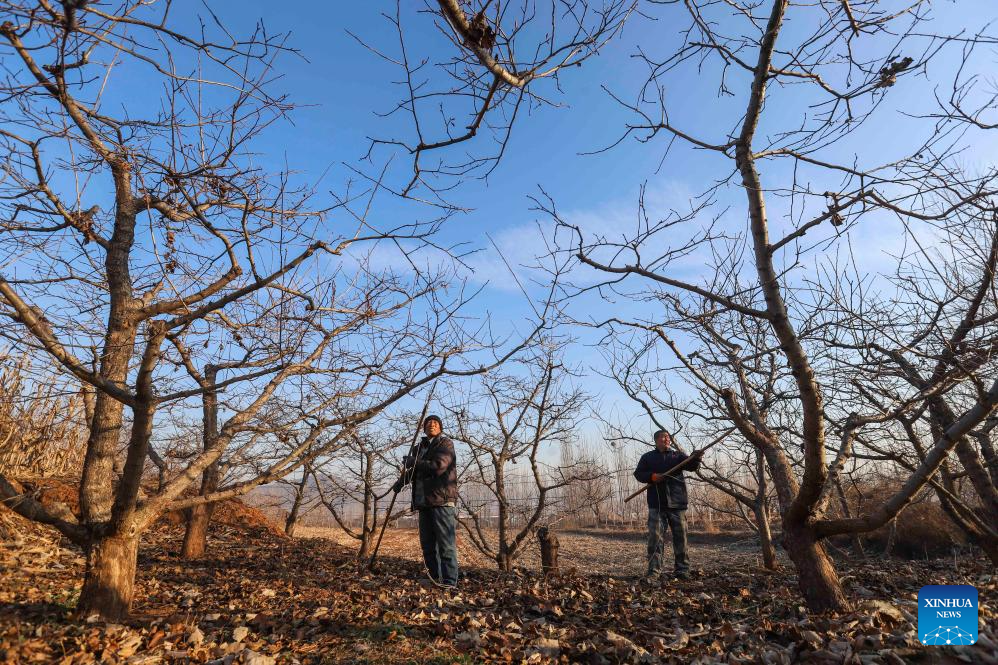 Farmers prune fruit trees at an orchard in Zunhua City, north China's Hebei Province, Dec. 6, 2025. As the solar term of Major Snow, also known as "Da Xue" in Chinese, is approaching, farmers are busy with agricultural production across the country. (Photo by Liu Mancang/Xinhua)