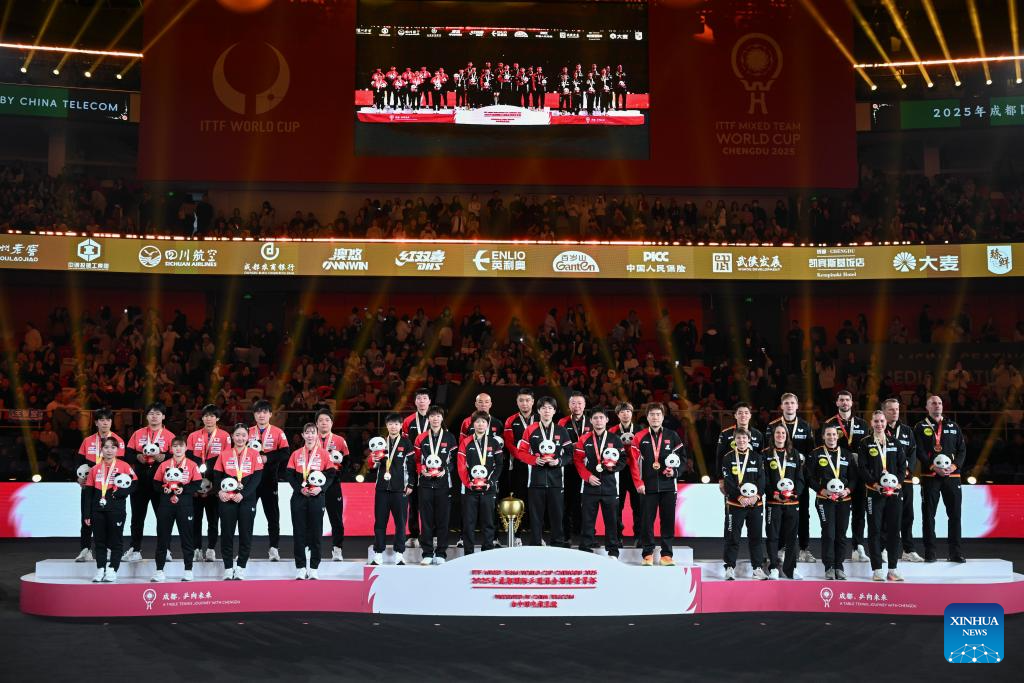 Gold medalists team China (C), silver medalists team Japan (L) and bronze medalists team Germany are seen during the awarding ceremony at the ITTF Mixed Team World Cup 2025 in Chengdu, southwest China's Sichuan Province, Dec. 7, 2025. (Xinhua/Wang Xi)