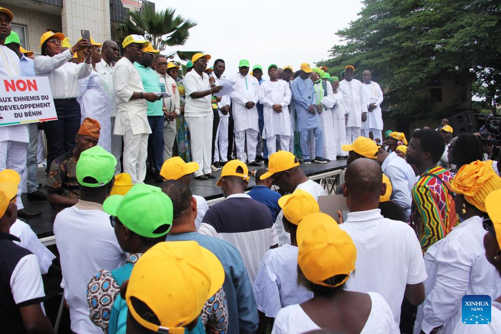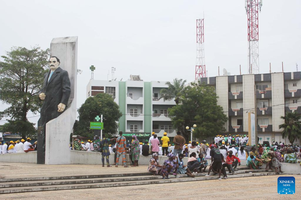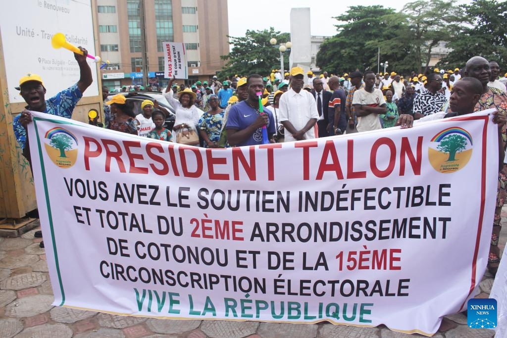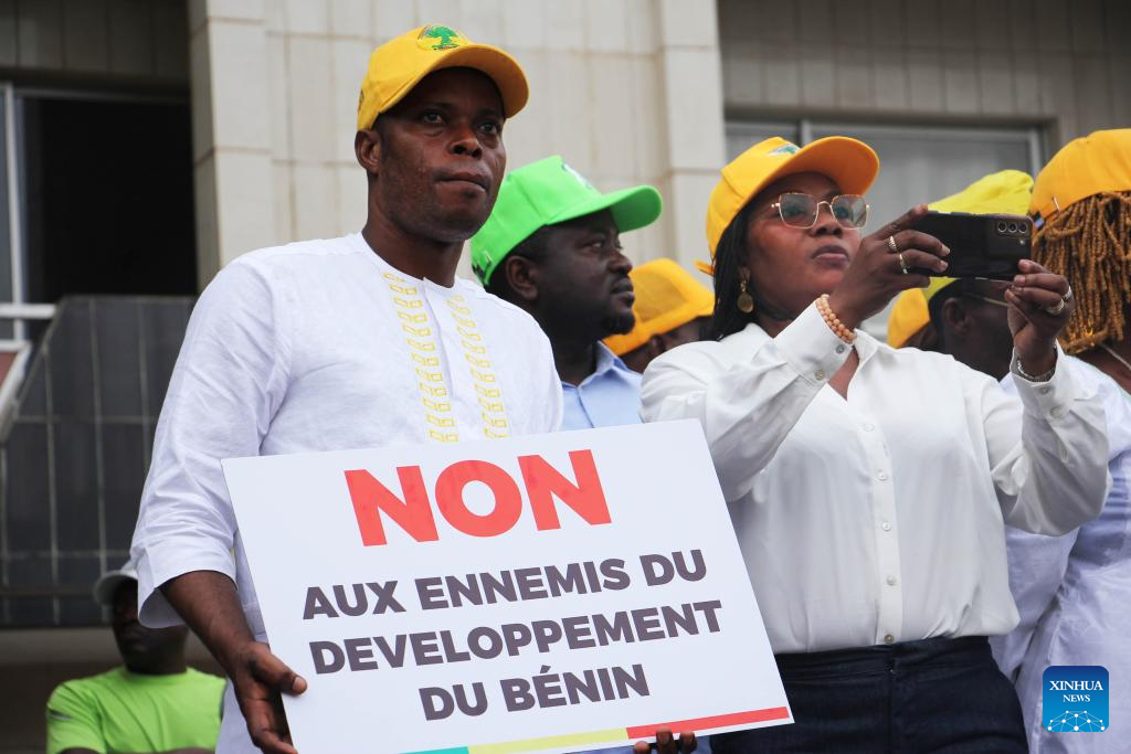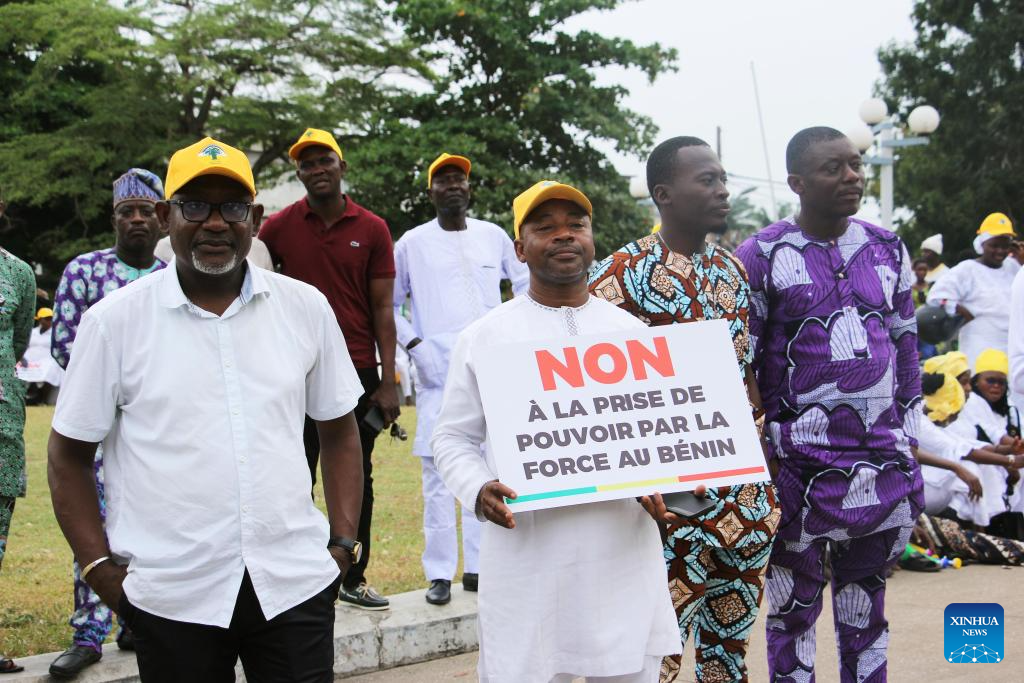 People gather to express their support for Beninese President Patrice Talon at Place Bulgarie in Cotonou, the economic capital of Benin, Dec. 8, 2025.