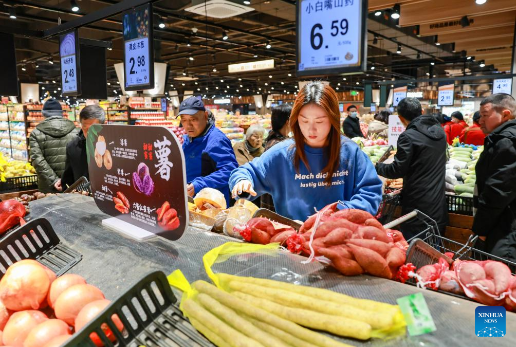 A consumer selects vegetable at a supermarket in Xinghua City, east China's Jiangsu Province, Dec. 10, 2025. China's consumer price index (CPI), a main gauge of inflation, rose 0.7 percent year on year in November, data from the National Bureau of Statistics showed Wednesday. (Photo by Zhou Shegen/Xinhua)