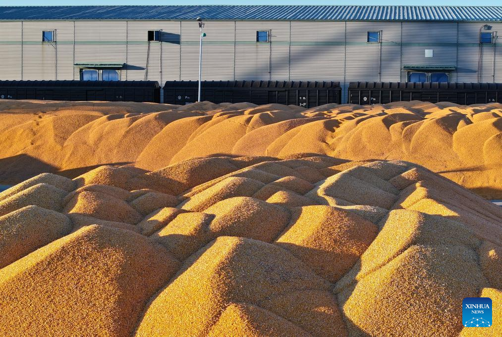 A drone photo shows corn kernels to be dried at a drying service station of a farming company under Beidahuang Group in northeast China's Heilongjiang Province, Oct. 14, 2025. Heilongjiang Province, a major grain producer in northeast China, saw its 22nd bumper harvest with a record-breaking grain output reaching 82 million tonnes this year, data from the National Bureau of Statistics (NBS) showed on Friday.