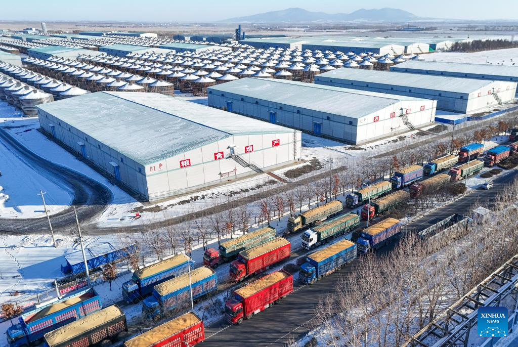 An aerial drone photo shows vehicles lining up to unload at a grain purchase and storage company in Fujin City, northeast China's Heilongjiang Province, Dec. 12, 2025. Heilongjiang Province, a major grain producer in northeast China, saw its 22nd bumper harvest with a record-breaking grain output reaching 82 million tonnes this year, data from the National Bureau of Statistics (NBS) showed on Friday.
