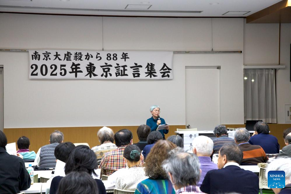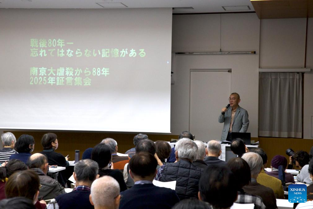 A representative of the Japanese civic group "No More Nanjing" speaks during a testimony meeting on the Nanjing Massacre in Tokyo, Japan, Dec. 11, 2025. (Xinhua/Li Ziyue)