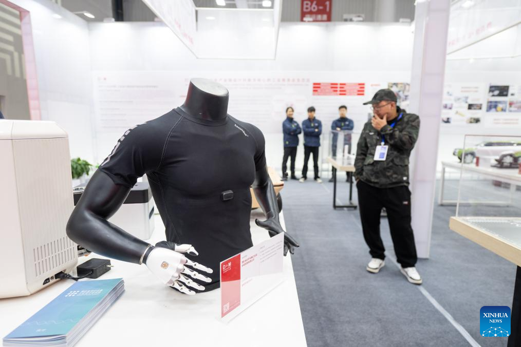An intelligent bionic hand is pictured at the 2025 Wuhan International Industrial Design Expo in Wuhan, central China's Hubei Province, Dec. 12, 2025. The expo kicked off here on Friday, featuring ten specialized exhibition areas including low-altitude economy, AI empowerment, and future industries. More than 100 enterprises participated in the exhibition. (Xinhua/Xiao Yijiu)