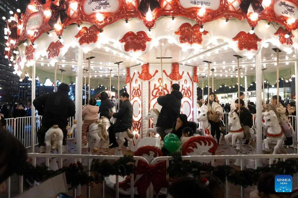 People ride a carousel during the 2025 Seoul Winter Festa at the Gwanghwamun Square in Seoul, South Korea, Dec. 12, 2025. (Photo by Jun Hyosang/Xinhua)