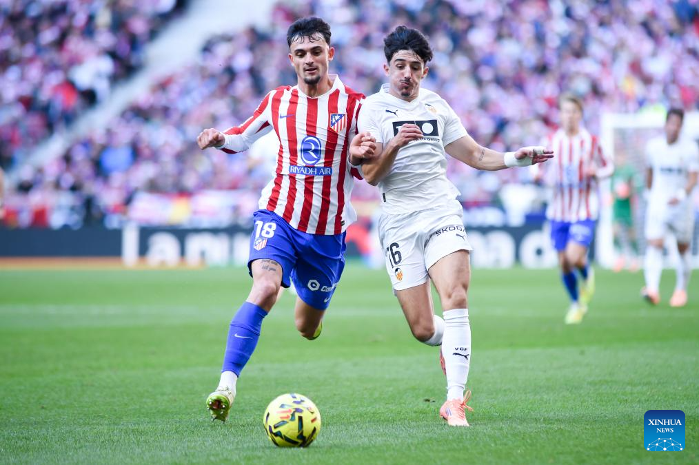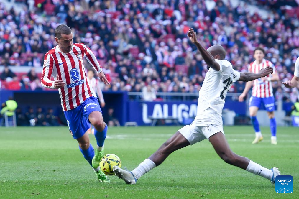 Atletico de Madrid's Antoine Griezmann (L) controls the ball during the Laliga football match between Atletico de Madrid and Valencia C.F. in Madrid, Spain, Dec. 13, 2025. (Photo by Gustavo Valiente/Xinhua)