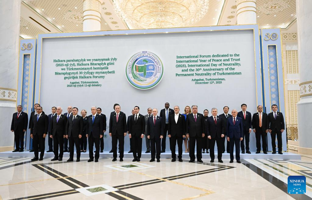 Chinese President Xi Jinping's special envoy Peng Qinghua, also vice chairman of the Standing Committee of China's National People's Congress, and other participants of the High-Level International Forum dedicated to the International Year of Peace and Trust pose for a group photo in Ashgabat, Turkmenistan.