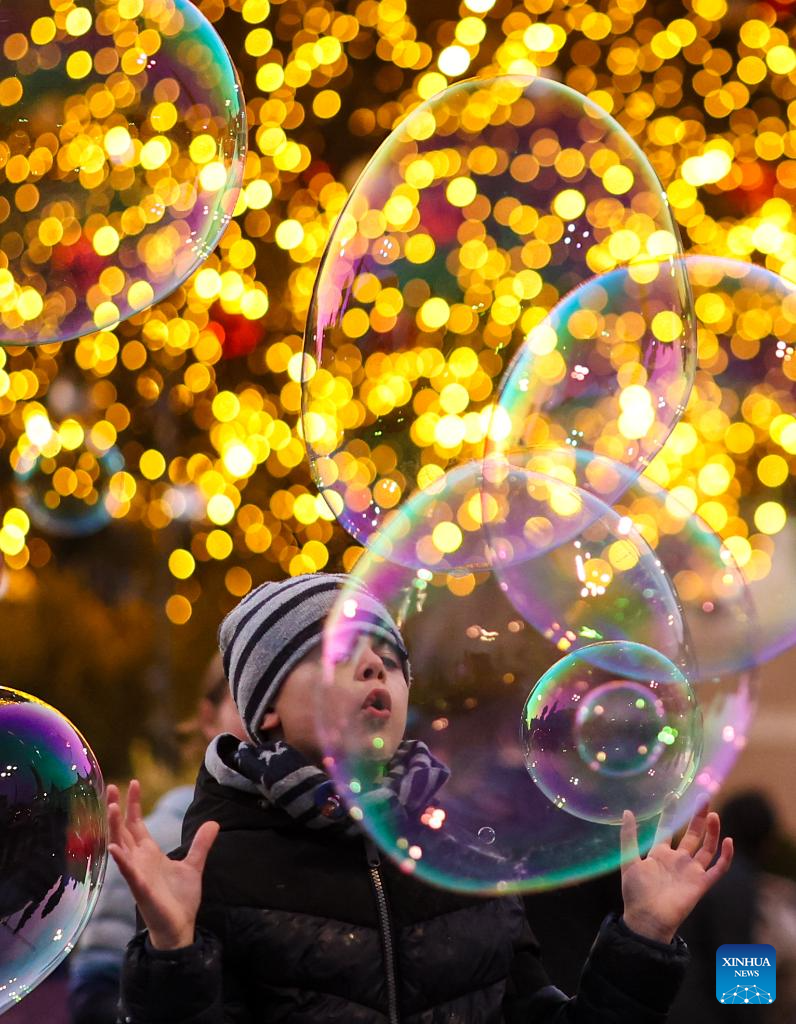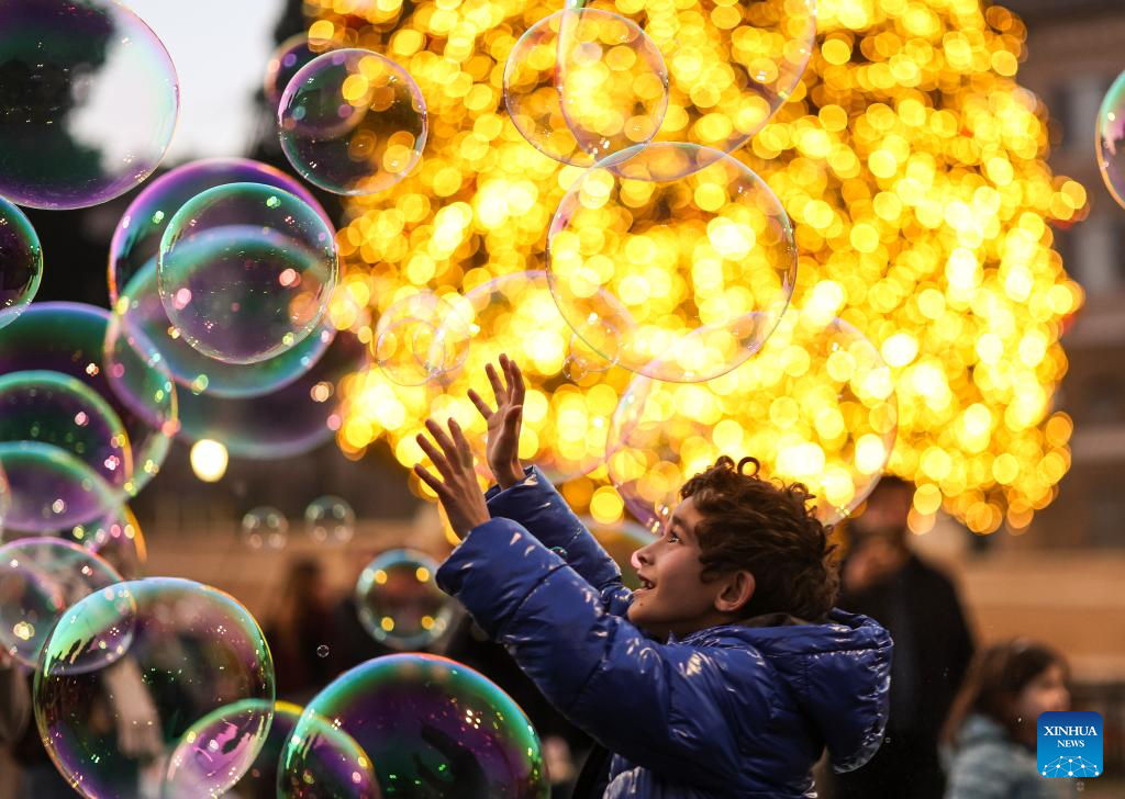 A boy plays with bubbles in front of a Christmas tree at Piazza del Popolo in Rome, Italy, Dec. 13, 2025. (Xinhua/Li Jing)