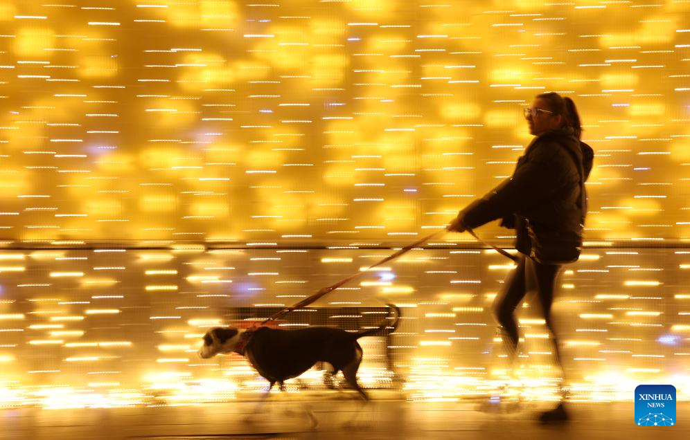 People walk past festive lights near Piazza del Popolo in Rome, Italy, Dec. 13, 2025. (Xinhua/Li Jing)