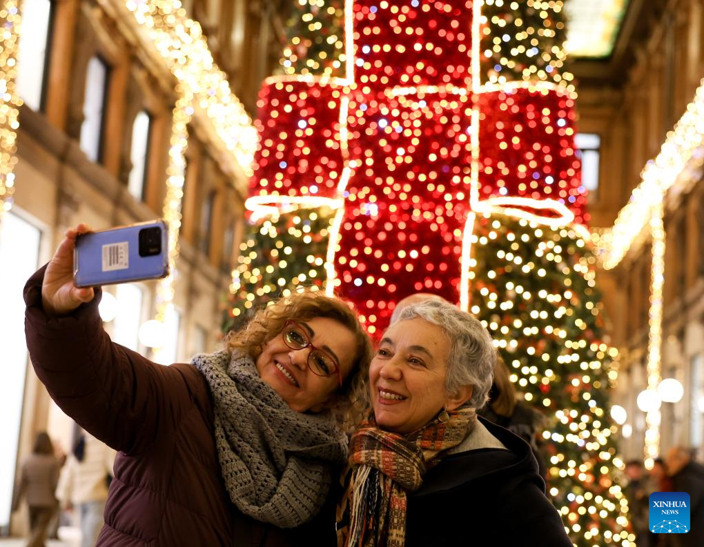 People take selfies with festive lights at Galleria Alberto Sordi in Rome, Italy, Dec. 13, 2025. (Xinhua/Li Jing)