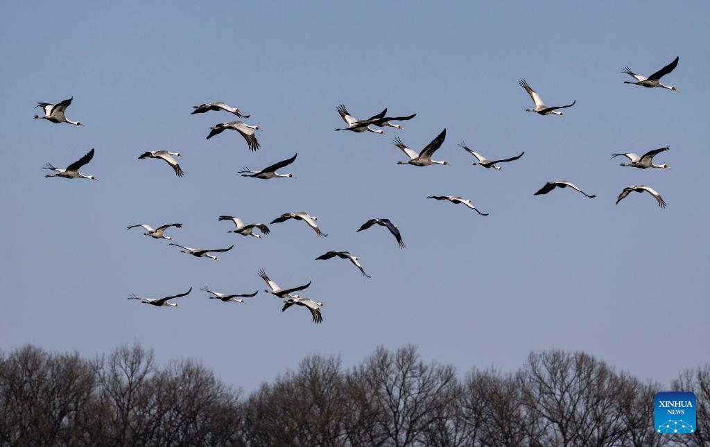 This photo taken on Dec. 21, 2025 shows white-naped cranes in Paju in Gyeonggi Province, South Korea. (Photo by Jun Hyosang/Xinhua)