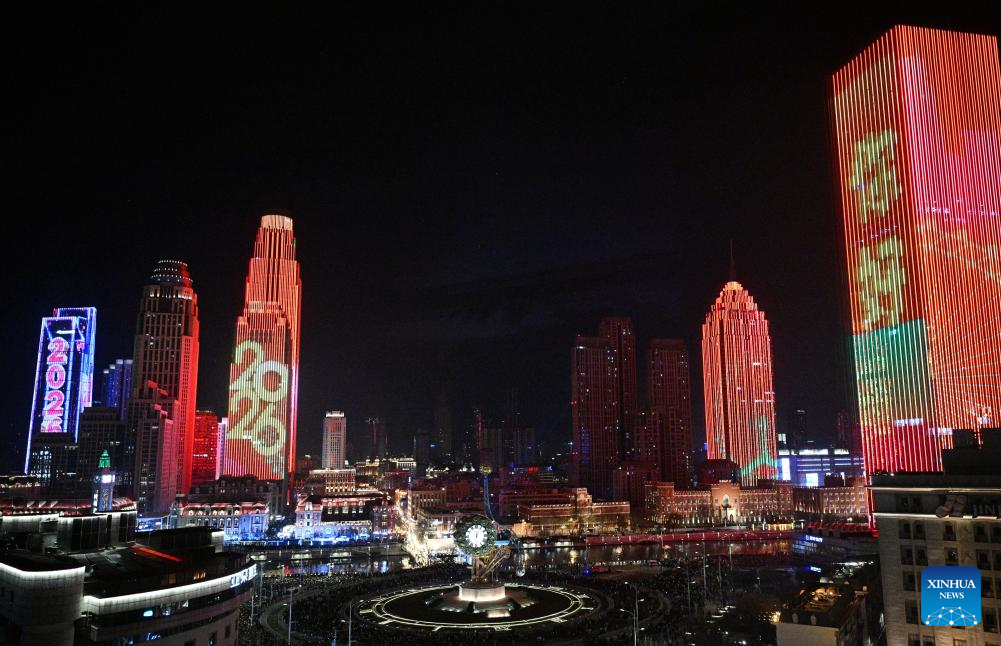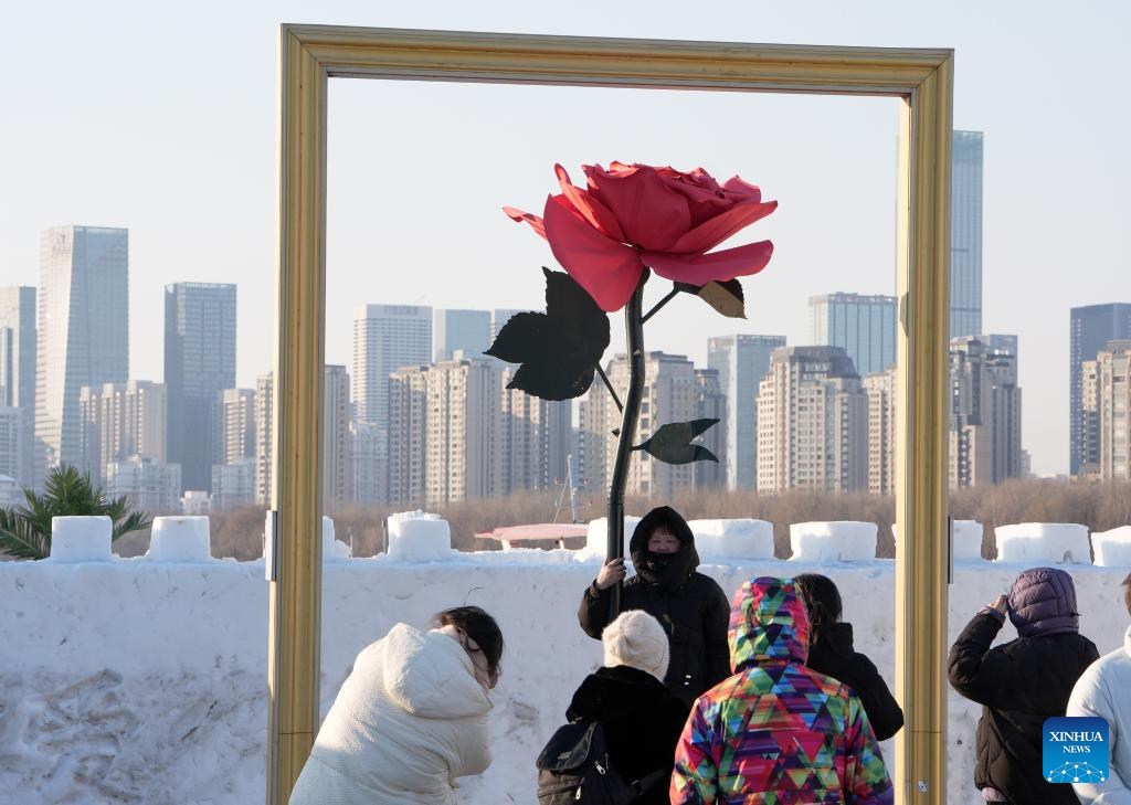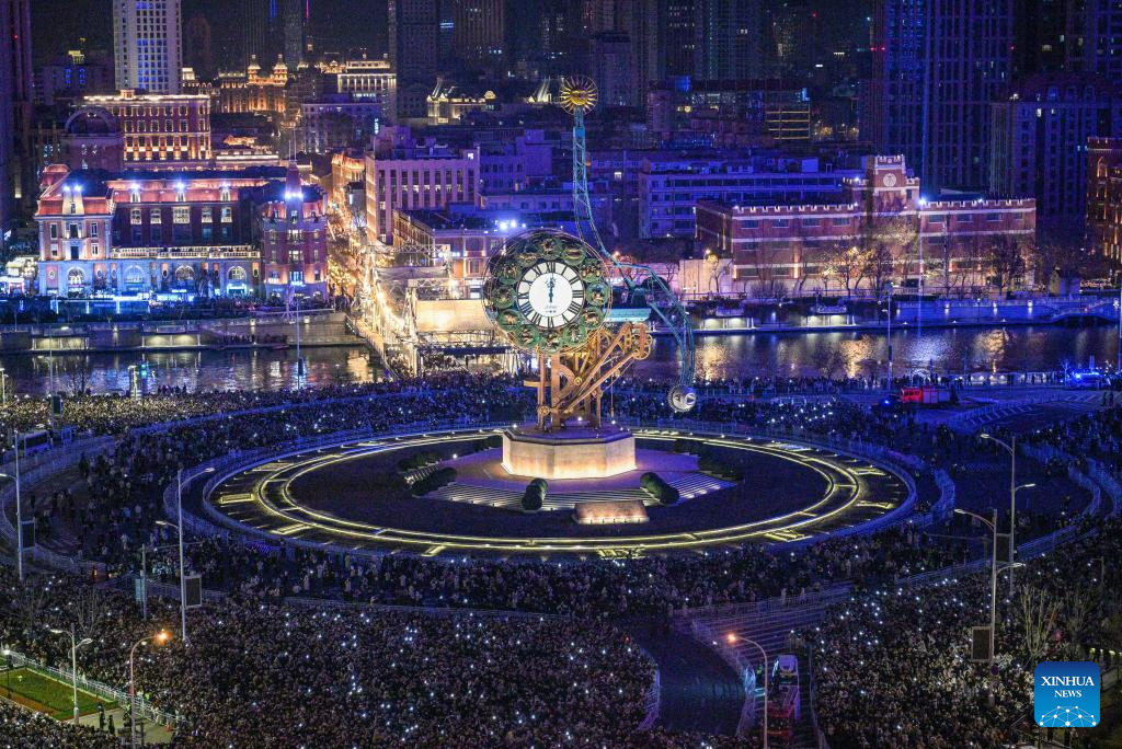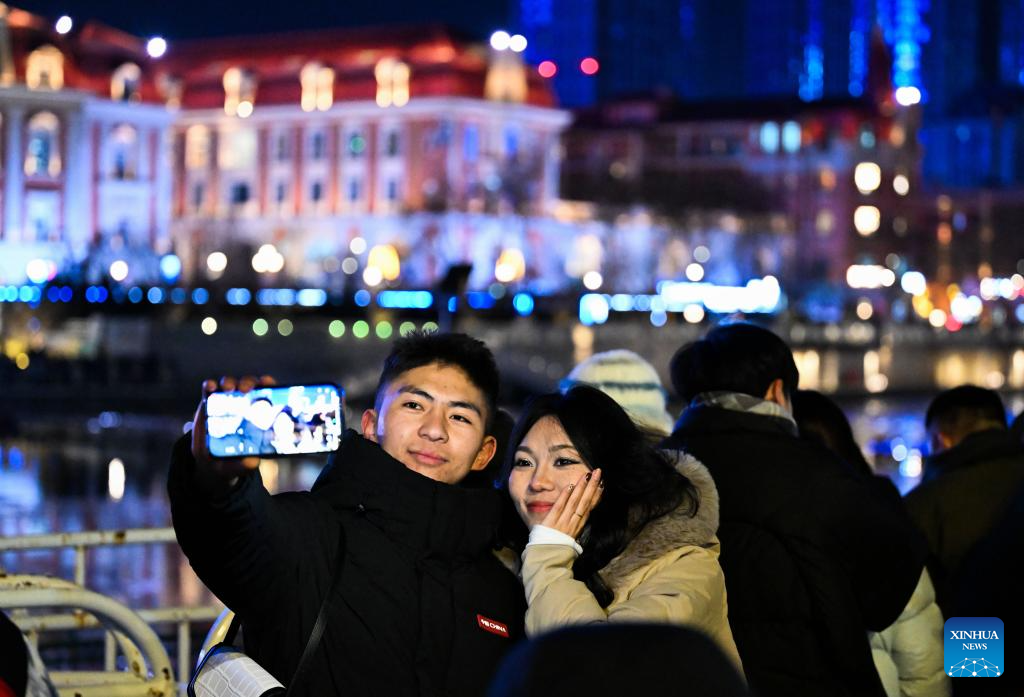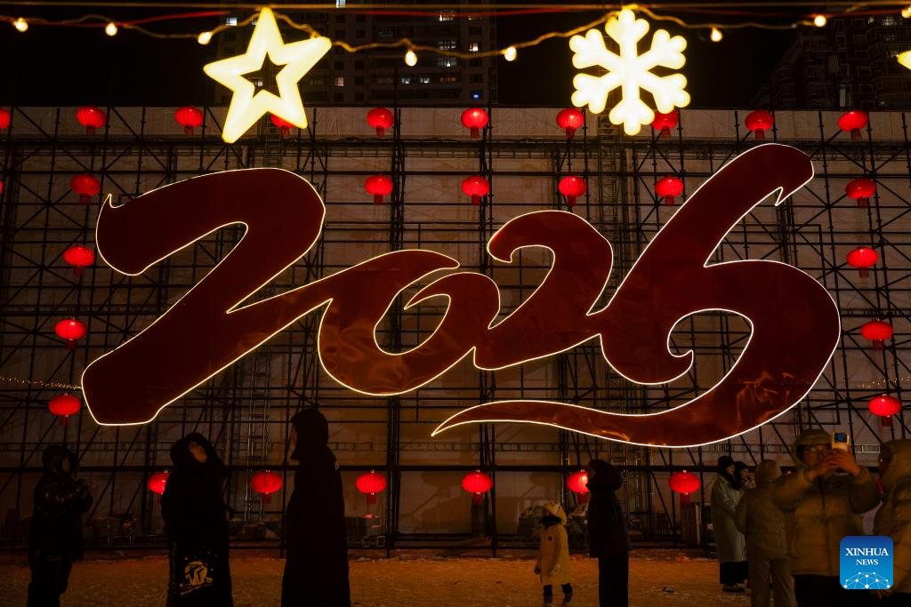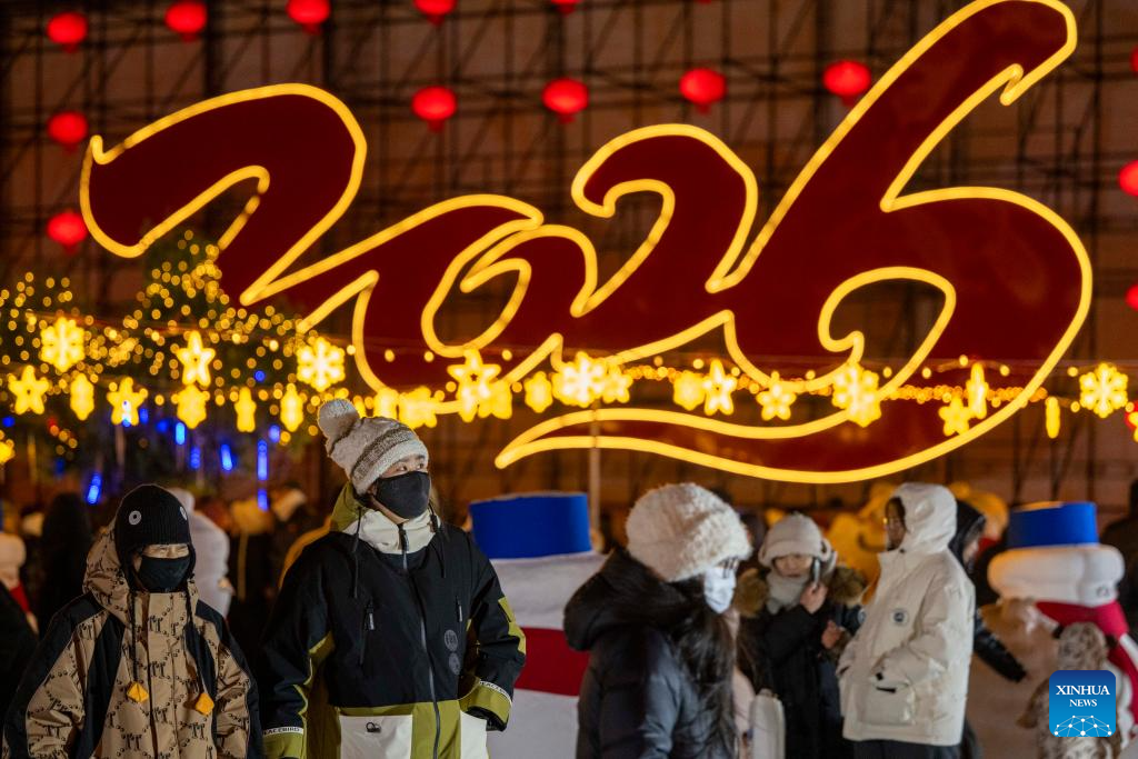 People have fun at the Heilongjiang Radio and TV Tower square in Harbin, northeast China's Heilongjiang Province, Dec. 31, 2025.