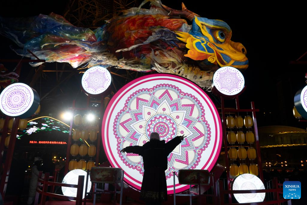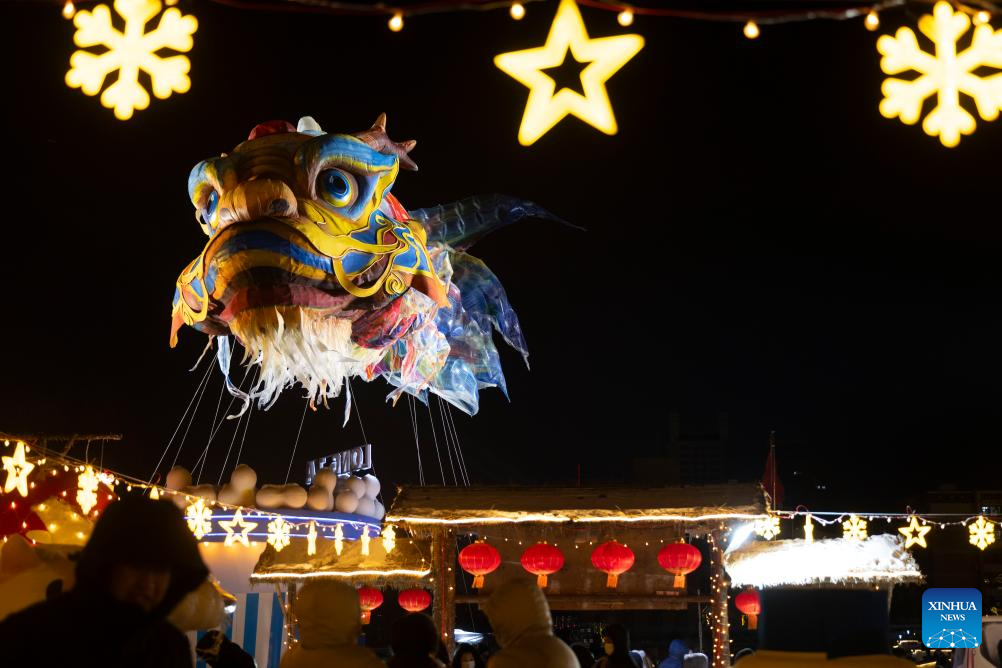 People view a giant dragon-head fish lantern at the Heilongjiang Radio and TV Tower square in Harbin, northeast China's Heilongjiang Province, Dec. 31, 2025.
