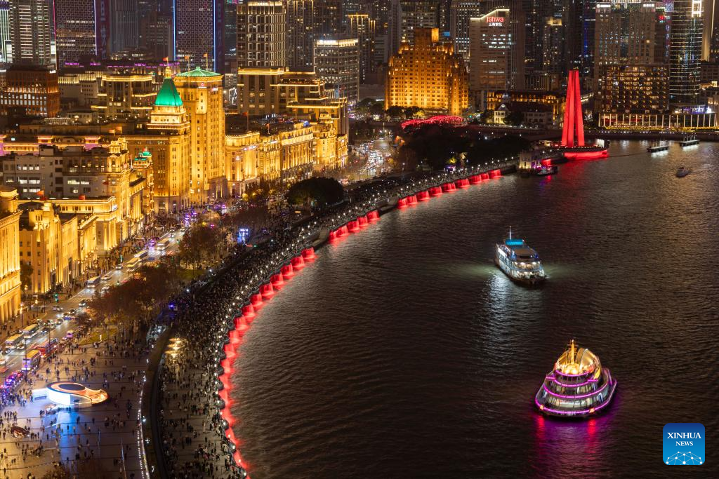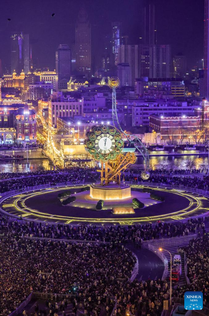 An aerial drone photo shows the illuminated Bund area in celebration of the New Year in east China's Shanghai, Dec. 31, 2025. (Xinhua/Wang Xiang)