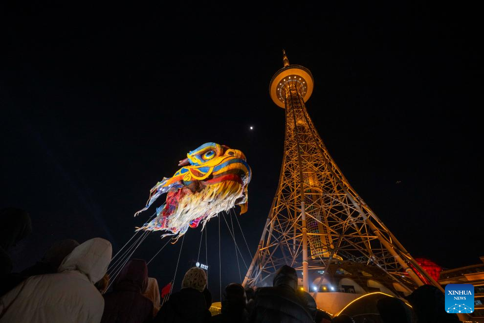 This photo shows a giant dragon-head fish lantern at the Heilongjiang Radio and TV Tower square in Harbin, northeast China's Heilongjiang Province, Dec. 31, 2025.