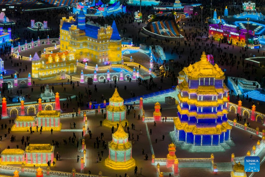 An aerial drone photo shows tourists visiting the Harbin Ice-Snow World in Harbin, northeast China's Heilongjiang Province, Dec. 31, 2025.
