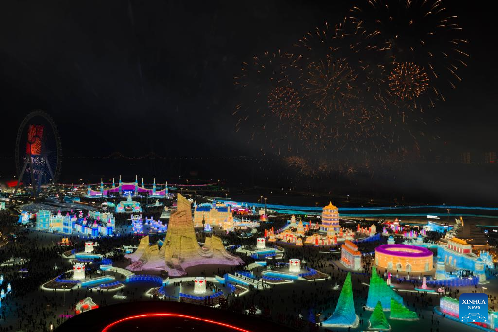 An aerial drone photo shows a firework show staged at the Harbin Ice-Snow World in Harbin, northeast China's Heilongjiang Province, Dec. 31, 2025.