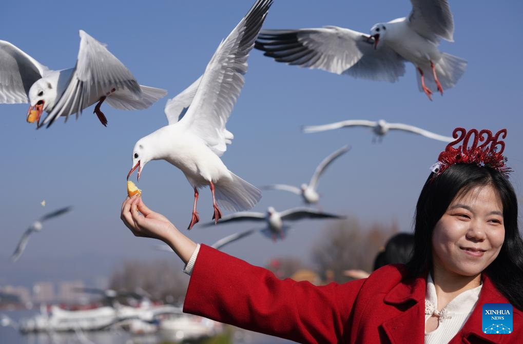 A woman feeds black-headed gulls at the Dianchi Lake scenic spot in Kunming, southwest China's Yunnan Province on Jan. 1, 2026. People across China celebrate the arrival of 2026 with a wide range of festivities on Thursday, the first day of the year. (Photo by Liang Zhiqiang/Xinhua)