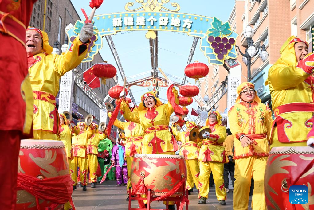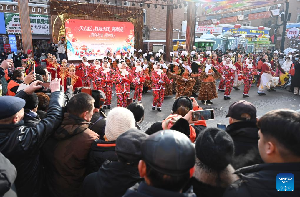 A folk festivity performance is staged at the Xinjiang International Grand Bazaar in Urumqi, northwest China's Xinjiang Uygur Autonomous Region, Jan. 1, 2026. A festive event drew crowds to the Xinjiang International Grand Bazaar on Thursday as people gathered to ring in the New Year. (Photo by Xu Rui/Xinhua)
