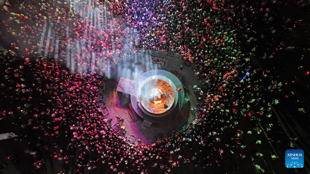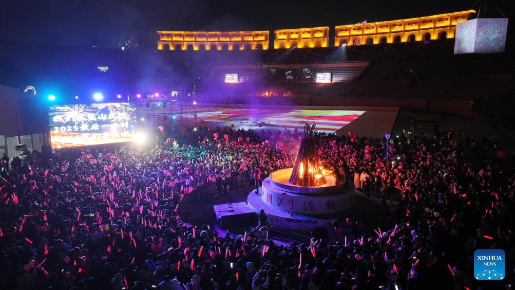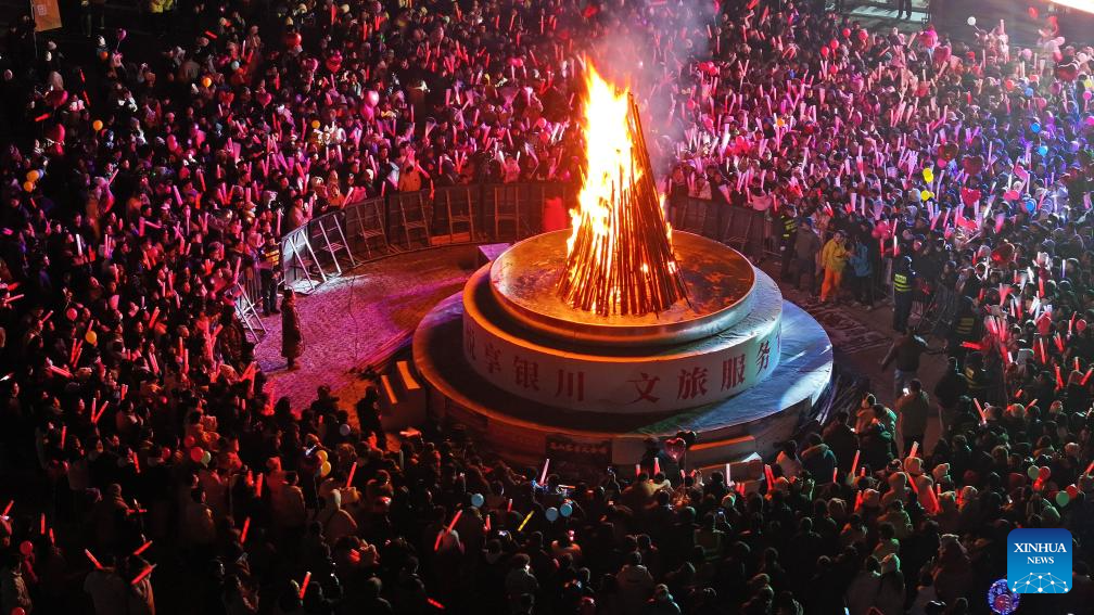A drone photo shows people gathering around a bonfire during a New Year celebration event at Lanshan Park in Yinchuan, northwest China's Ningxia Hui Autonomous Region, Dec. 31, 2025.