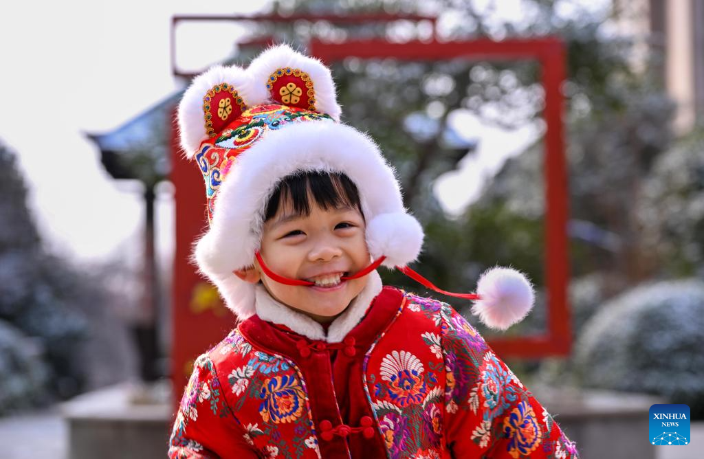 A child wearing a traditional tiger-head hat and Chinese festive attire is pictured in Xiayi County of Shangqiu, central China's Henan Province on Jan. 1, 2026. People across China celebrate the arrival of 2026 with a wide range of festivities on Thursday, the first day of the year. (Photo by Miao Yucai/Xinhua)