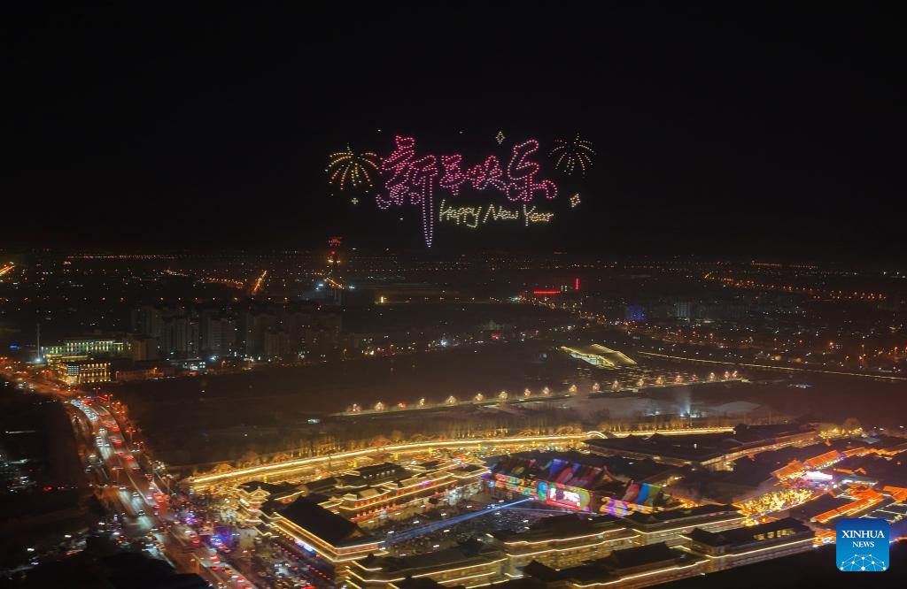 An aerial drone photo shows a drone light show staged in celebration of the New Year in Yangliuqing ancient town in Tianjin, north China, Jan. 1, 2026.