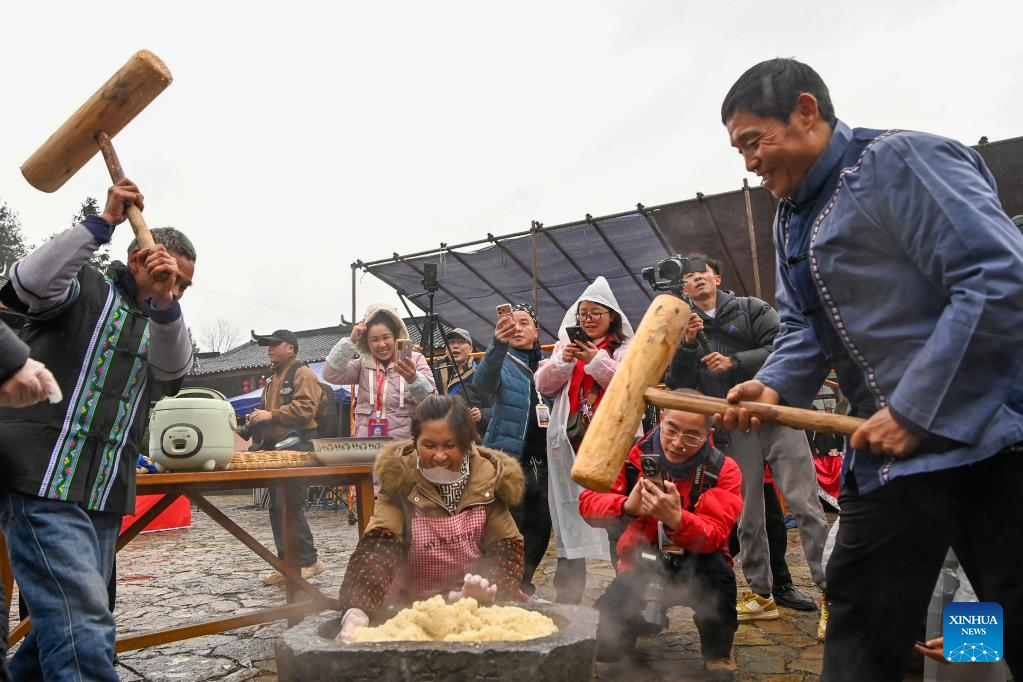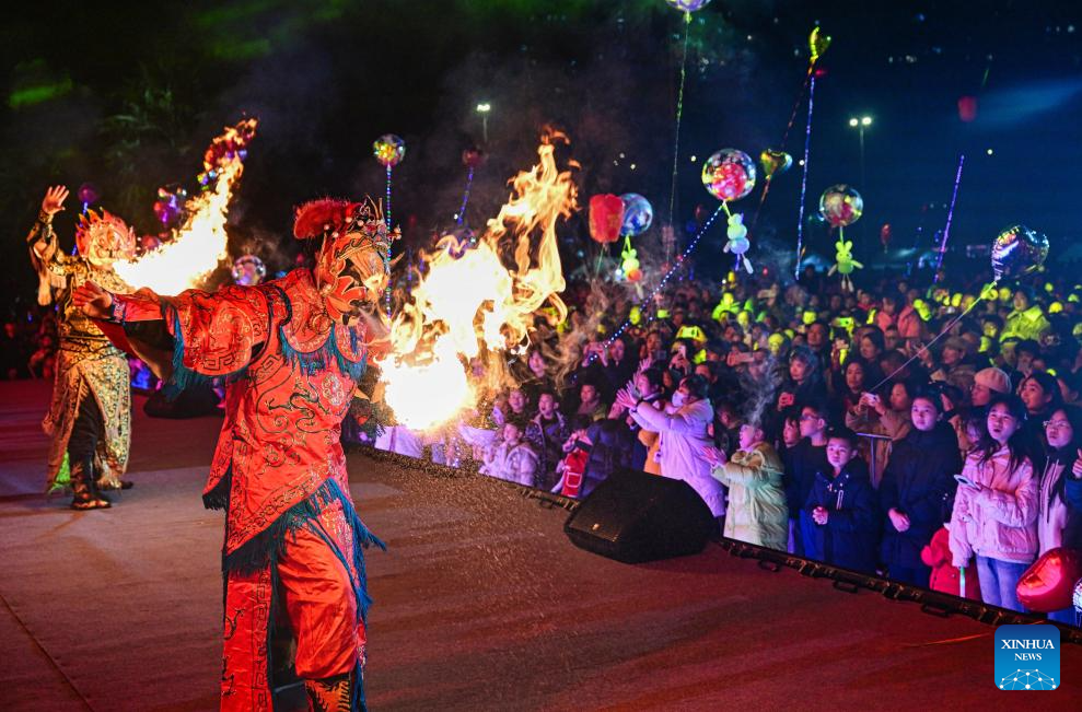 Intangible cultural heritage inheritors and cast members stage a performance for tourists at a scenic spot of Youyang Tujia and Miao Autonomous County, southwest China's Chongqing Municipality, on Dec. 31, 2025. Various activities were held across China to celebrate the new year. (Photo by Qiu Hongbin/Xinhua)