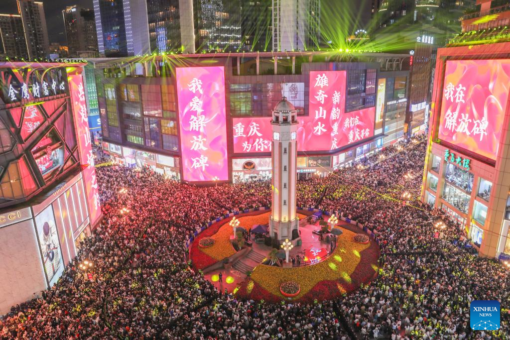 People gather at Jiefangbei commercial block to greet the New Year in Chongqing, southwest China, Dec. 31, 2025.